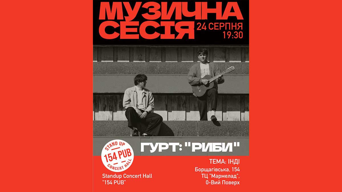 Сьогодні, 24 серпня, у столичному 154 PUB відбудеться перша «Музична сесія» — новий формат живих виступів українських виконавців. Відкриє серію концертів київський інді-гурт «Риби», відомий своїми експериментами зі звучанням та авторськими композиціями.