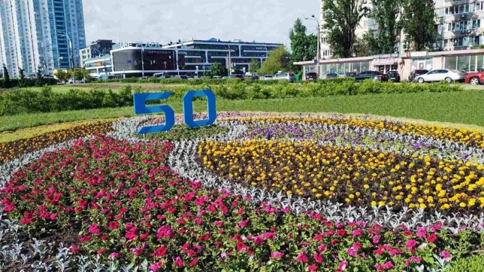 На Оболоні облаштували квіткову клумбу до 50-річчя району: прикрасили петуніями й чорнобривцями