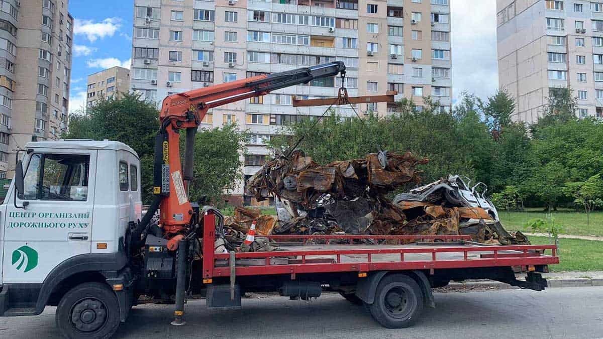 Сьогодні у Святошинському районі Києва комунальні служби провели роботи з переміщення автомобілів, пошкоджених під час обстрілу.