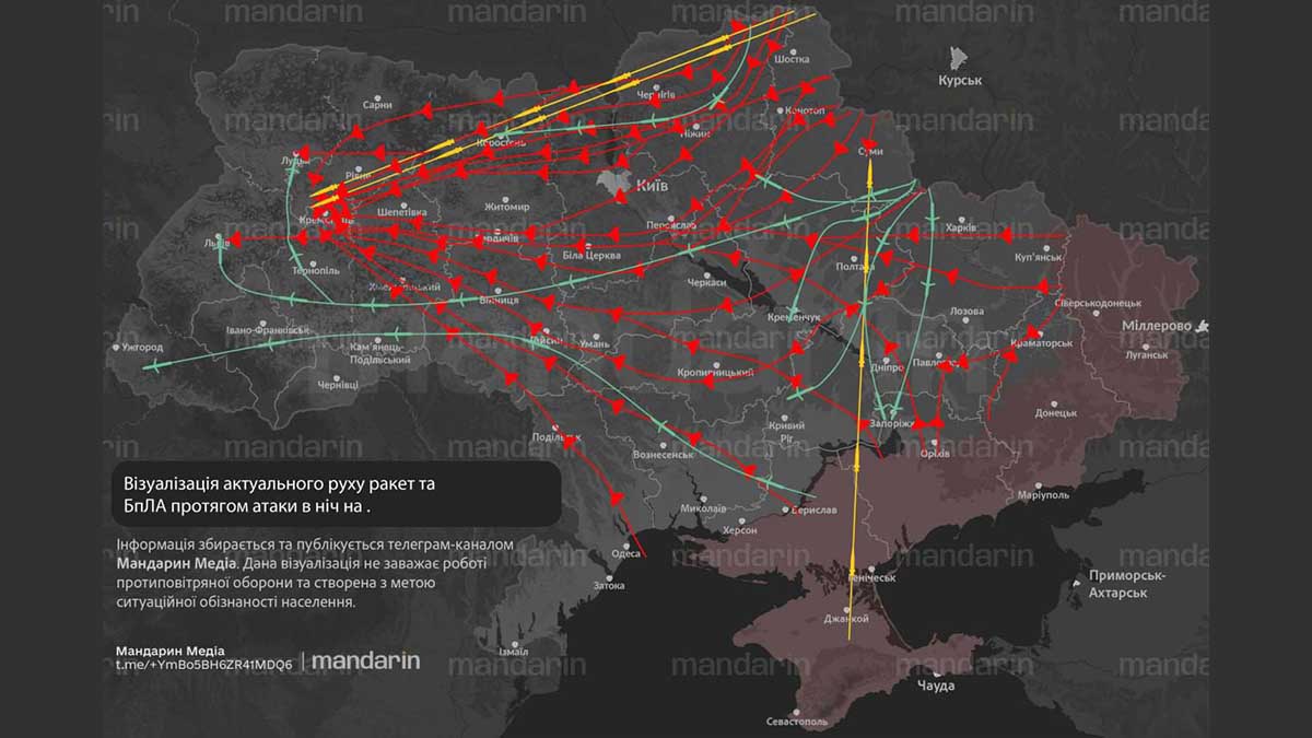 Росія здійснила черговий масований комбінований удар по Україні вночі, застосувавши «Кинджали», «Циркони», «Калібри», ракети Х-101 та близько 350 дронів «Шахед». Під ударом опинилися Київ, Львів, Запоріжжя, Дніпро, Суми, Рівне, Чернігів та інші міста. Вперше за час великої війни атакували Мукачево: 12 людей постраждали, п’ятеро перебувають у стаціонарі.