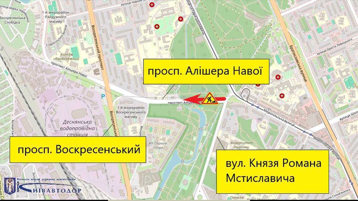 27 серпня з 8:00 до 20:00 у Києві буде частково обмежено рух проспектом Алішера Навої. Обмеження діятимуть на ділянці від вулиці Князя Романа Мстиславича до проспекту Алішера Навої, 16 — у напрямку Воскресенського.