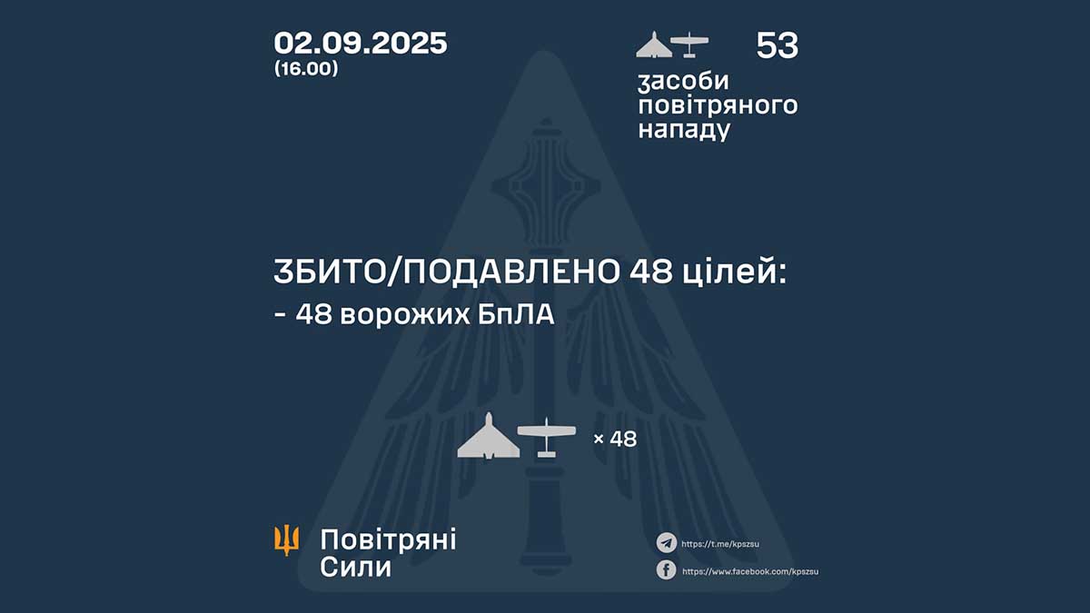Російські окупанти здійснили повторну атаку з північного напрямку, застосувавши 53 ударні БпЛА типу Shahed і безпілотники-імітації. Більшість дронів прямувала у напрямку столиці. Станом на 16:00 сили протиповітряної оборони збили або подавили 48 ворожих дронів, повідомили у Повітряних силах.