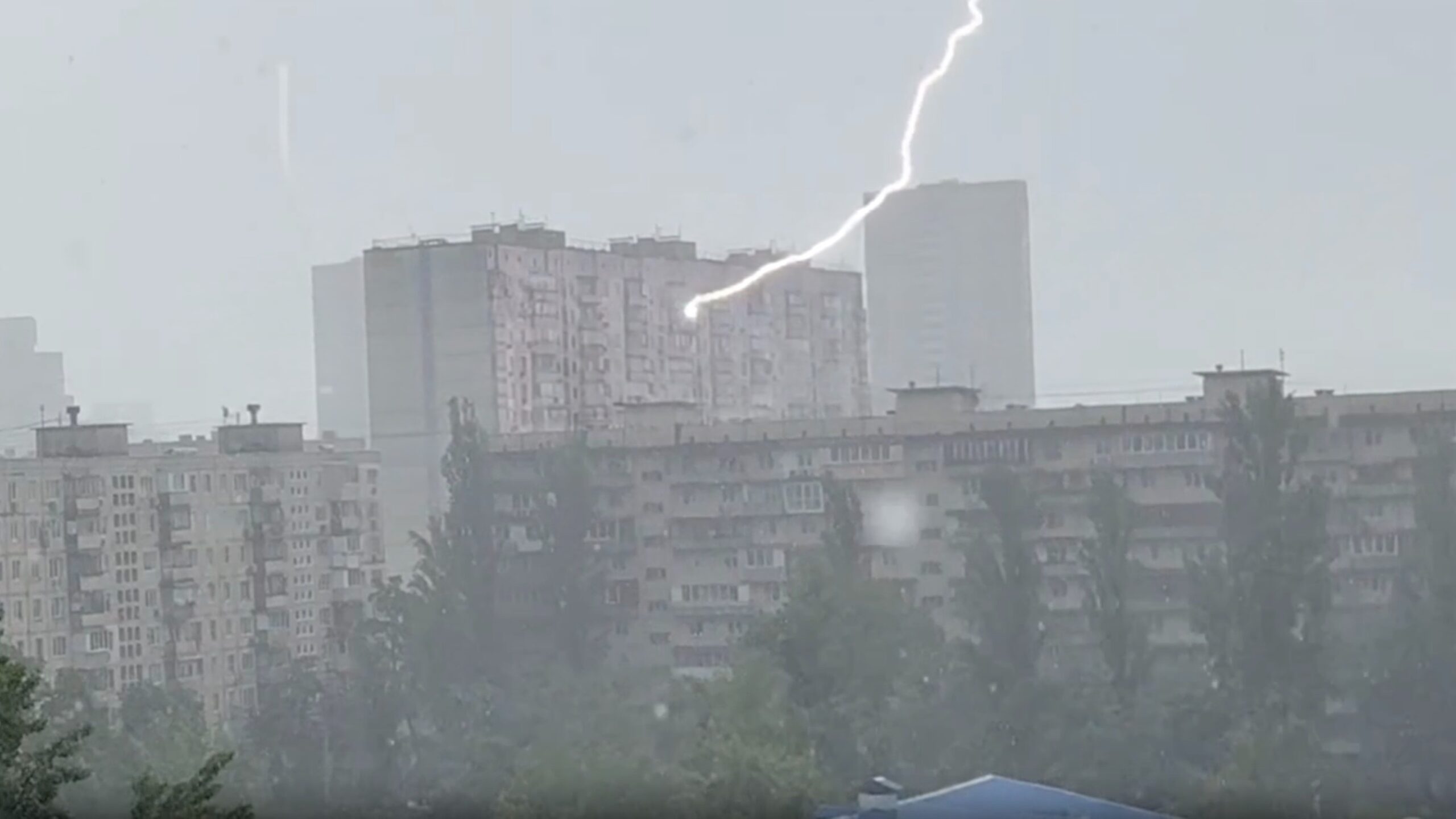 У Києві 28 травня під час сильної грози блискавка влучила у житловий будинок на Оболоні, як інформує «Великий Київ». На відео, яке поширили у соціальних мережах, зафіксовано момент удару блискавки — яскравий спалах біля верхніх поверхів будівлі. За попередньою інформацією, постраждалих немає, як і серйозних пошкоджень споруди.
