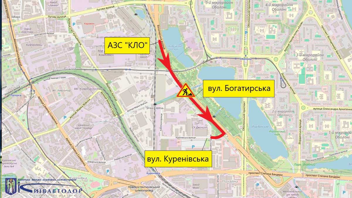 З 2 вересня до 15 жовтня у Києві частково обмежать рух вулицею Богатирською у напрямку центру міста. Обмеження діятиме на ділянці від АЗС «КЛО» до вулиці Куренівської разом із перехрестям.